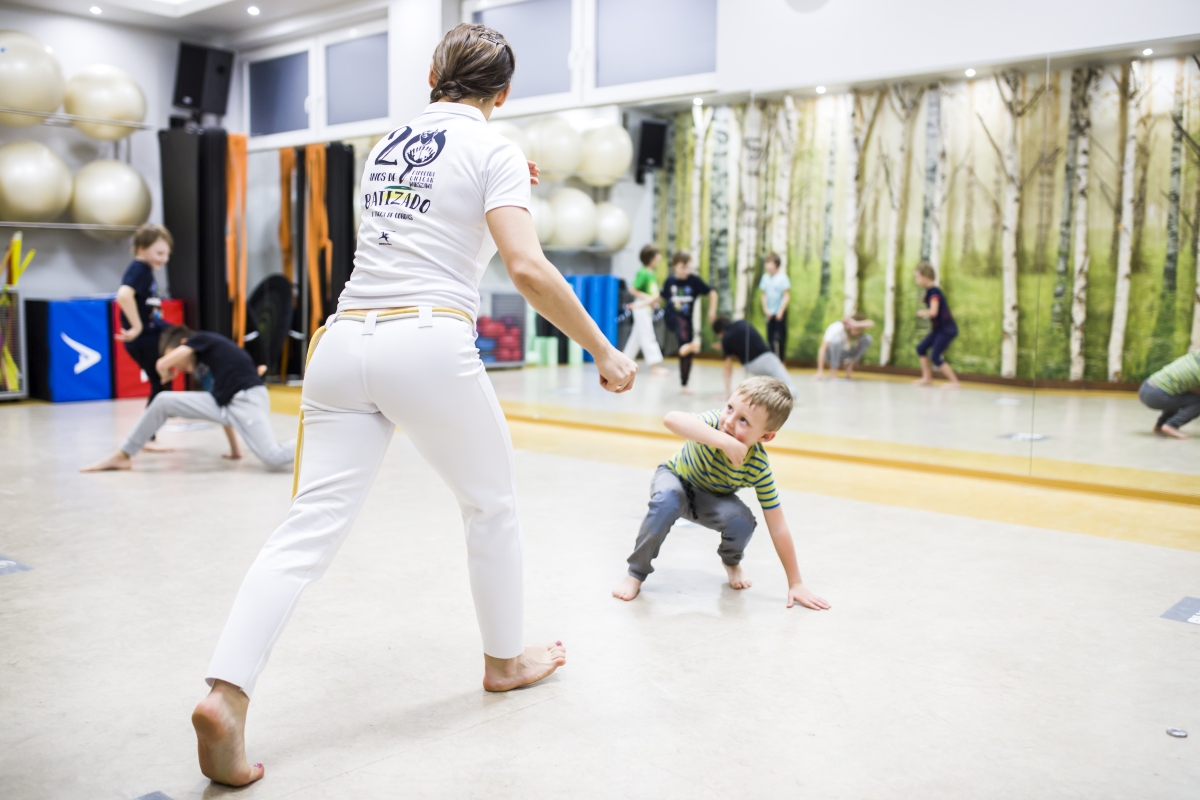 Capoeira kids to trening, który wpływa na wzrost kontroli i świadomości własnego ciała, rozwój koordynacji ruchowej i poprawę kondycji.